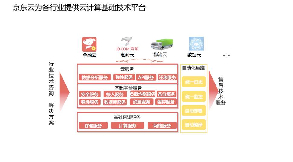 京东云把内部IT的能力、云计算大数据等基础技术向全社会提供服务,助力传统行业实现互联网+的技术架构和业务升级。为各行业提供技术咨询及解决方案,帮助传统行业通过云架构实现互联网+。