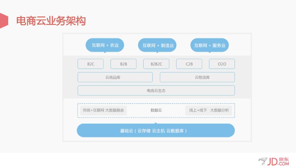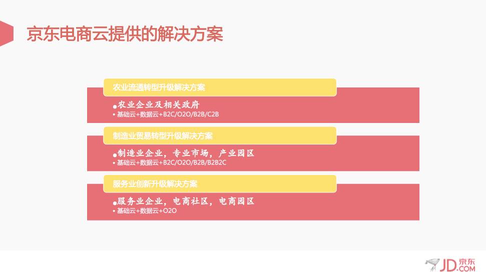 通过京东电商云的产品架构,能够支撑农业的农产品流通,制造业的贸易升级,以及服务业的创新。除了提供这些技术产品和资源能力以外,京东通过电商云的生态,会给合作伙伴提供更多的服务,包括培训和咨询,以及物流、运营、线下的代运营,以及金融服务等。通过电商云生态,帮助传统企业完成快速而成功的互联网转型。