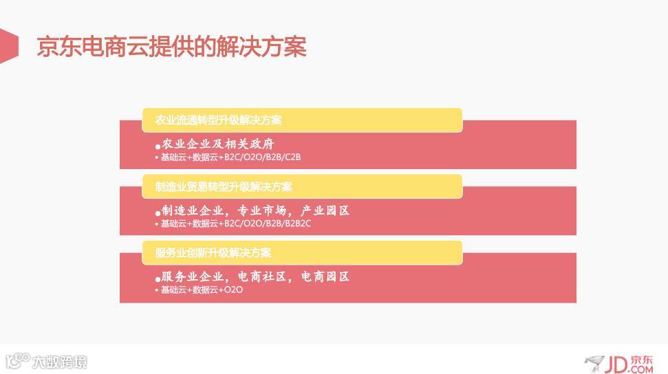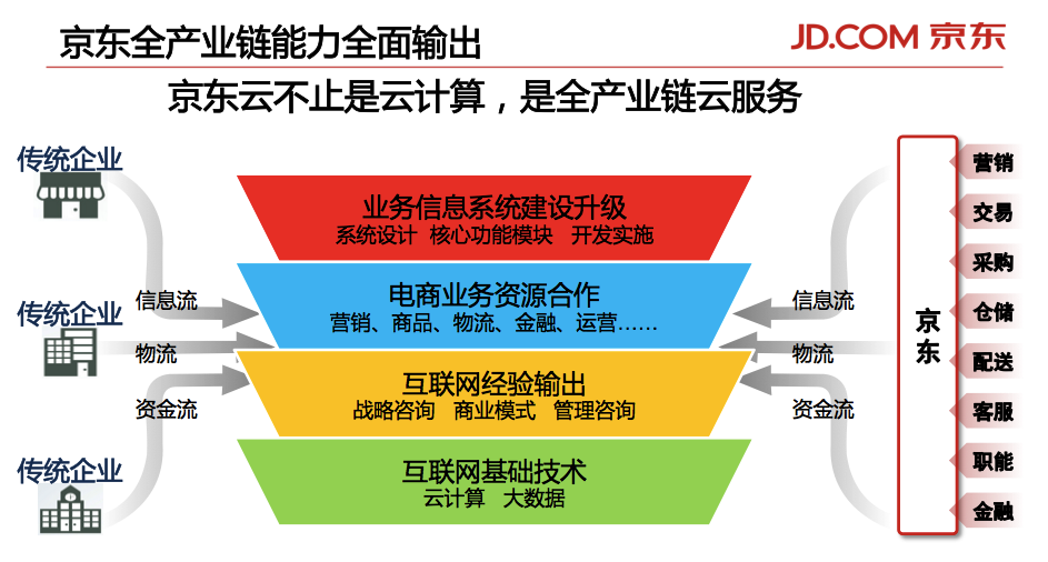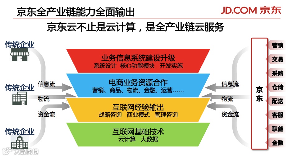 京东依托十余年的电商经验和技术,构筑了全产业链的互联网电商能力,并将各种核心能力对外开放,从根本上帮助企业的互联网转型需求,为上千家中国企业提供云服务解决方案,帮助其实现互联网转型。