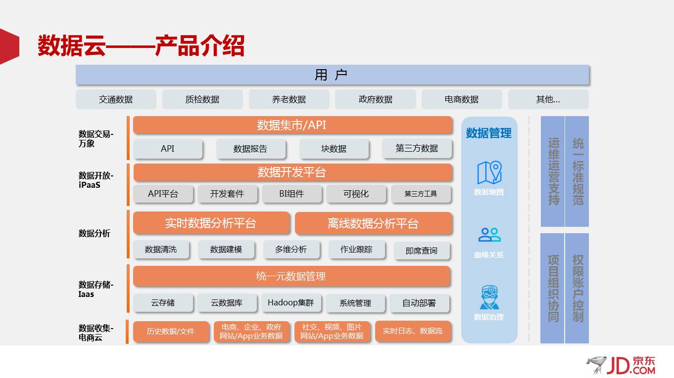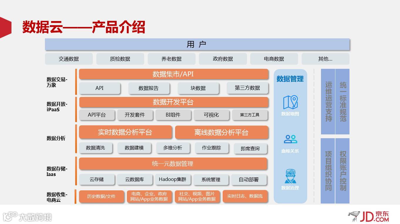 京东数据云从数据存储,到数据分析,包括实时分析,离线分析,再到数据收集,提供一个整套的生产形势的数据平台帮助企业进入大数据时代。致力于打造一个生态化的大数据平台来快速、准确、科学、低成本的帮助企业分析数据,把数据变成价值。