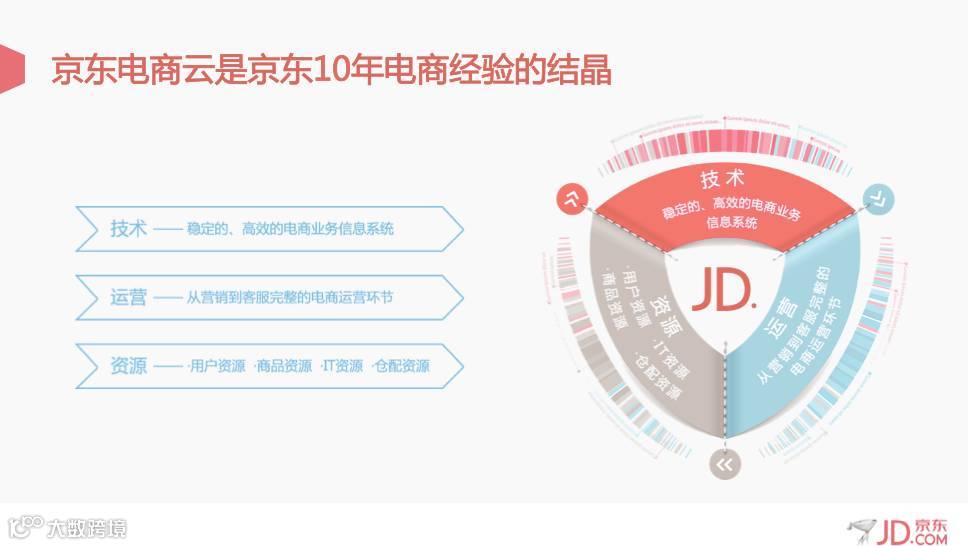 京东已积累了全方位的资源:从电商平台的技术和经验、电子商务的从业经验到电商领域的全产业链资源,到京东的用户、商品、基础云IT、仓储配送等资源,京东电商云是真正的京东全产业链能力的整体输出,是京东十余年电商经验的结晶。