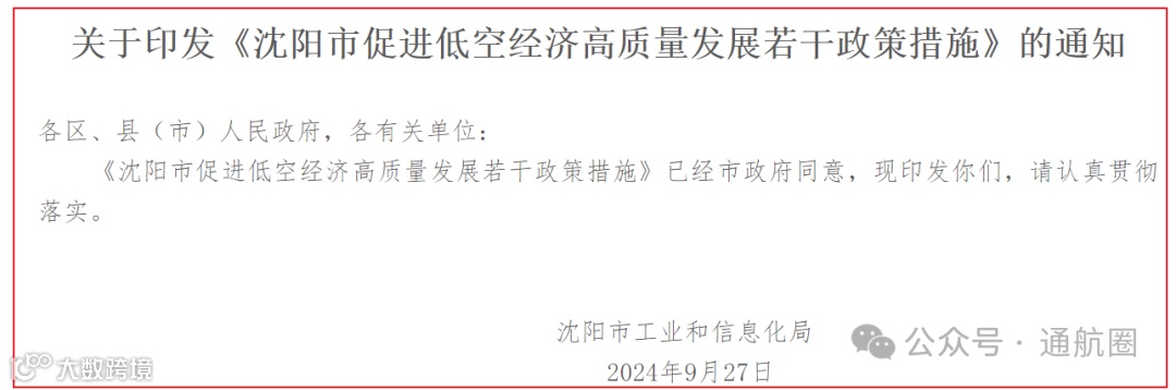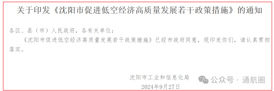 日前,沈阳市工信局正式印发《沈阳市促进低空经济高质量发展若干政策措施》。该文件曾在10月10日举行的辽宁省航空产业发展大会上发布。据通航圈了解,该文件围绕促进低空经济产业发展,从五个方面提出了12条政策措施,其中多项补助达到千万元级别。此外,措施中还明确提到设立沈阳市低空经济产业发展基金,吸引社会资本注入,支持低空经济产业技术研发、生产制造、人才培育、运维服务等细分领域优质项目建设,推动低空经济高质量发展。