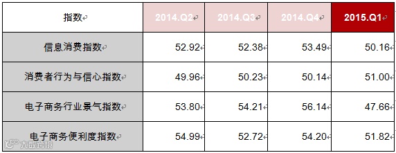 报告显示,从2014年第二季度到2015年第一季度的四个季度中,信息消费指数分别为52.92,52.38,53.49,50.16(指数取值以50为基准值。如果本期指数大于50,则表示该指标本期的值大于上一期的值,反之则相反)。由此可见,“互联网+零售业”的综合指数总体呈上涨趋势,线上零售业正在蓬勃发展中。在三个子指数中,只有一个指数——电子商务行业景气指数在2015年第一季度低于50,孙立坚教授解释道,“第四季度,‘双十一’等大型促销活动引爆了线上线下的消费狂欢,而春节后是零售行业的低谷期,所以,相比之下,第一季度的电商行业景气指数会有一定程度的下降。”
