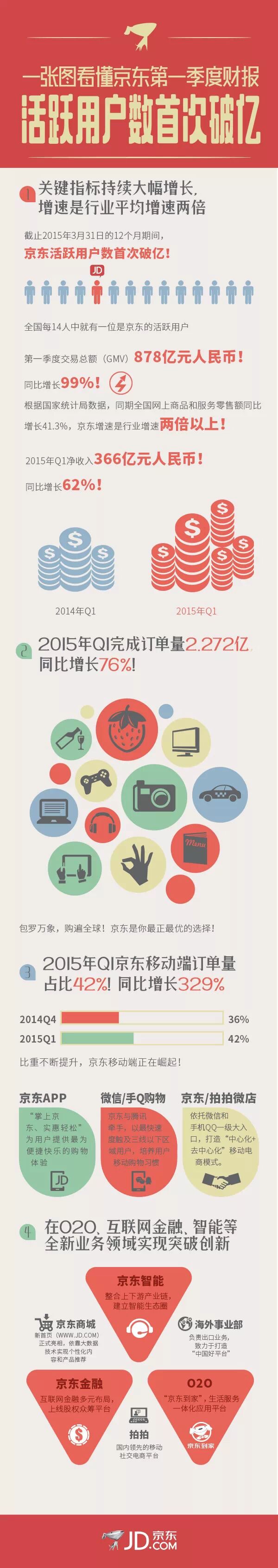 2015年5月8日,国内最大的自营电商企业京东集团(JD.COM)(纳斯达克股票代码:JD),正式发布其截至2015年3月31日的2015财年第一季度业绩。过去12个月京东活跃用户数首度破亿,国内电商领军地位日益稳固。