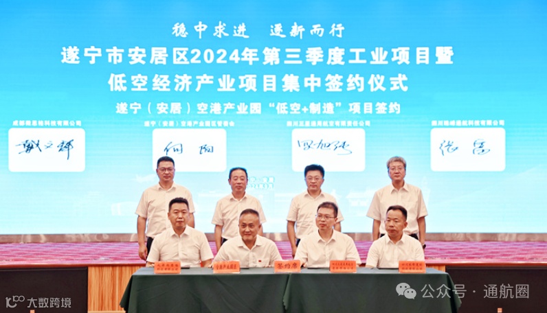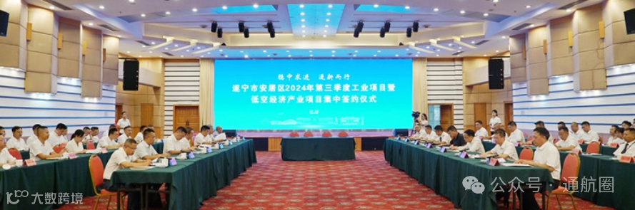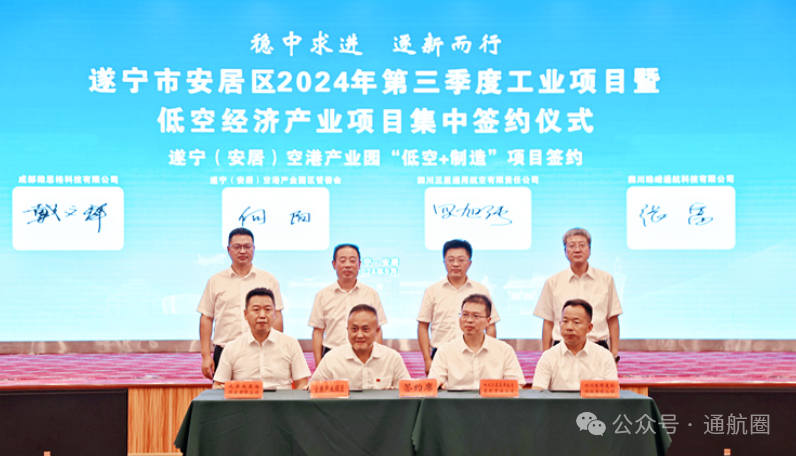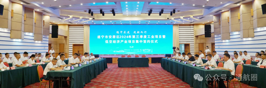 当天,遂宁市安居区2024年第三季度工业项目暨低空经济产业项目集中签约仪式举行,总投资37.65亿元的16个项目成功签约,涉及先进材料、机械与装备制造、低空经济、食品及特色消费品产业等领域。签约仪式上,安居经安居经开区制造业项目、安居经开区碳基新材料基地项目、遂宁(安居)空港产业园“低空+制造”项目、遂宁(安居)空港产业园“低空+文旅”项目进行了签约。中国民用航空飞行学院遂宁分院正式授牌遂宁(安居)空港产业园为“低空经济产业创新研究中心分中心”。