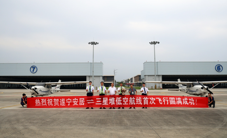 9月28日,上午10时38分,从广汉机场起飞的2架塞斯纳C-172S飞机平稳降落在去年投运的可起降空客320、波音737、国产C919等大飞机的通用机场——遂宁安居机场,这标志着遂宁安居至广汉三星堆低空航线首次飞行圆满成功。据介绍,此次航线航程约163公里,飞行高度约2100米,航行时间约1小时,比汽车快1个半小时左右,既缩短了两地通勤时间,沿途能清晰俯瞰三星堆、中国死海、观音湖、广德寺、七彩明珠、海龙凯歌等景区。