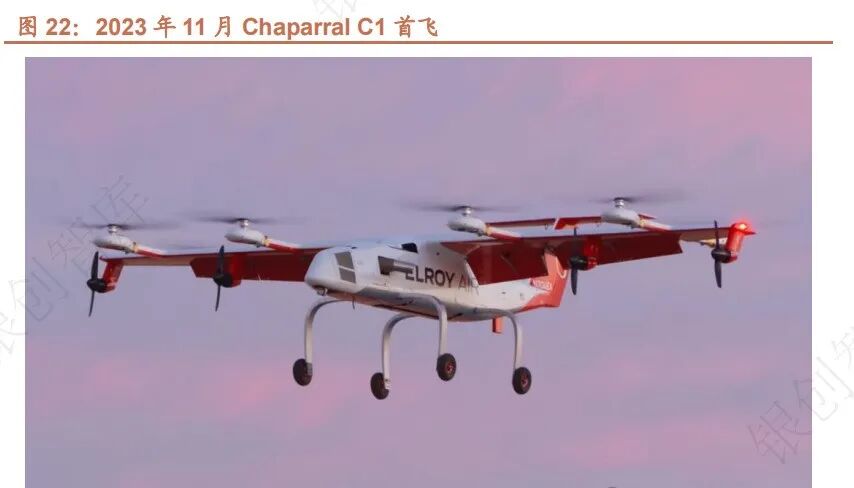 2023 年 11 月实现涡轮发电机混动 eVTOL 行业首飞。Elroy Air 于 2016 年在旧金山成立,起初计划开展空中出租车研制,后来转变到物流 eVTOL 方向。自成立以来,Elroy Air 已获得来自洛克希德·马丁、Shield Capital 等超过 8400 万美元的投资,并与美国军方、梅萨航空公司、布里斯托公司(Bristow)和联邦快递(FedEx)等建立合作关系。经历 7 年研发之后,Elroy Air 的涡轮发电机混动 eVTOL Chaparral C1 于 2023 年 11 月成功实现行业首飞。据 Elroy Air,目前公司积压订单价值超 30 亿美元。