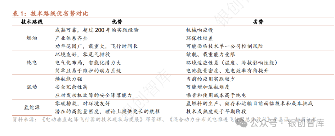 当前主流飞行器动力方案包括燃油、纯电、混动以及氢能源四种,各具优势。传统燃油有载重大、航时长的优点;纯电是清洁能源,适配智能化,噪音小,但航时短、负载能力弱;混动拥有纯电的优势,同时弥补了续航短板;氢能仍在早期发展阶段,有望在大机型上率先应用。目前新兴厂商普遍布局纯电和混动路线。