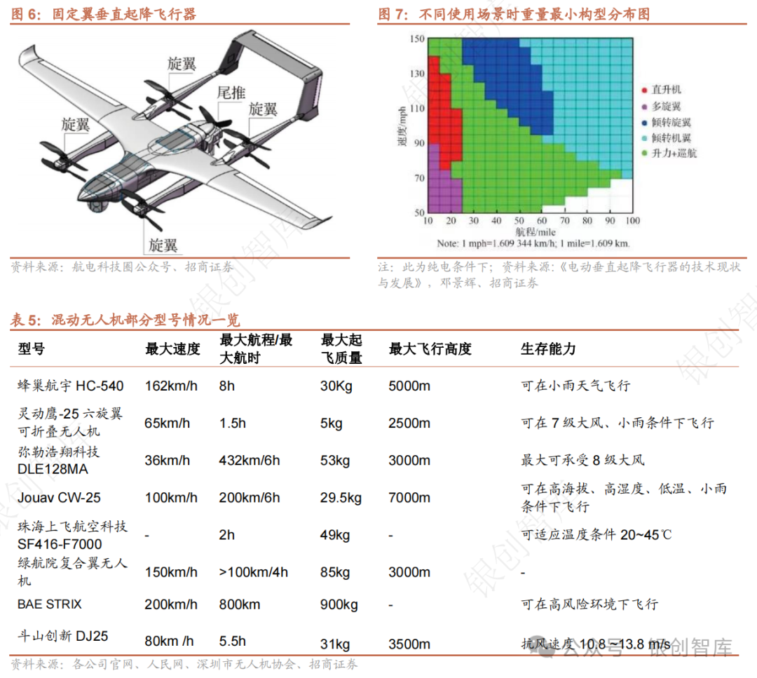 固定翼+混动方案优势众多。基于国防科技大学空天科学学院研究,该构架结合了固定翼和旋翼的优点,具备优异的高速飞行能力及垂直起降性能,兼具转换过渡稳定、可控性强的特点,适用飞行场景更广泛。众多固定翼垂直起降飞行器结构中,较为常见的有尾座式垂直起降、固旋翼垂直起降、倾转旋翼式垂直起降。混电系统结合发动机和电动机,利用较高能量密度燃油和更高效的电能转换以达到更高的能量利用率。同时,电推进部件使得飞行器和推进系统的设计更具灵活性,与固定翼垂直起降飞行器的结构和飞行工况高度耦合。由于目前电池能量密度研究进展缓慢,设计出的纯电动飞机重量很大。因此,在电池能量密度得到突破前,应用混电系统在提升固定翼垂直起降式飞行器方面有巨大潜力。