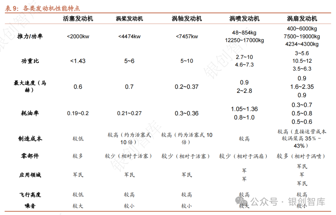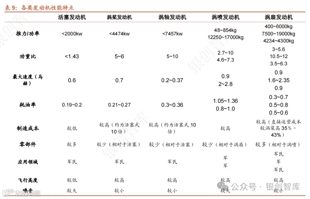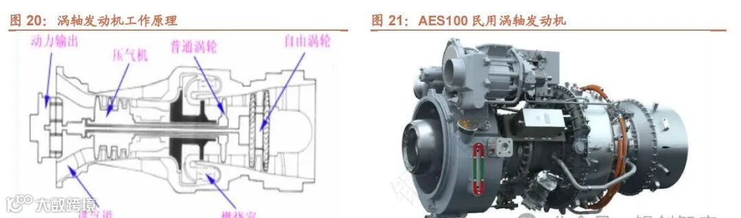 涡桨发动机和涡轴发动机差异。两者具有较大的通用性,易于相互借鉴和派生,但它们的减速传动系统、螺旋桨和动力输出方式略有差异。涡桨多用于固定翼飞机如运输机,其发动机的推力由 95%的螺旋桨拉力+5%的排气口燃气推力组成。涡轴多用于直升机,几乎没有发动机的燃气推力,其燃气能量基本转化为机械轴功率。两种发动机均由螺旋桨和燃气轮机组成,螺旋桨由涡轮带动。其结构复杂、制造成本高,但也具备输出功率高、功重比高(4 千瓦/千克以上)等优点,广泛应用于中低速飞机以及有严格要求的巡逻、反潜或灭火等类型飞机。