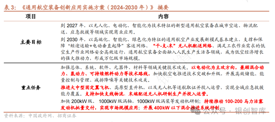 2024 年 03 月 27 日,工信部等四部门联合发布的《通用航空装备创新应用实施方案(2024-2030 年)》,标志着通航领域的顶层设计出台。其中涉及动力方案的表述包括:1)明确以电动化为主攻方向,兼顾混合动力、氢动力、可持续燃料动力等技术路线。2)建设“干-支-末”无人机配送网络;推进大中型固定翼飞机;支持加快支线物流、末端配送无人机研制生产并投入运营。3)持续推动 100-200 马力活塞发动机批量交付,实现市场规模应用。4)开展 400kW 以下混合推进系统研制。
