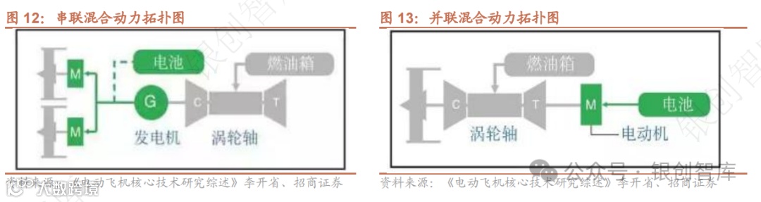 并联结构:发动机和电机可共同作用于推进器。在并联结构下,发动机与电机通过机械联接接入驱动系统,两个动力源根据不同工作模式,分别进行驱动或者联合驱动。因此,并联式混合动力可在不同飞行阶段调节发动机功率,结合电机,可在短时间内提升推力性能,从而具备较优的飞行高度和速度推力。同时,综合调配燃油与电能,可高效利用能量,从而实现油耗的降低以及航程或滞空时间的提升。