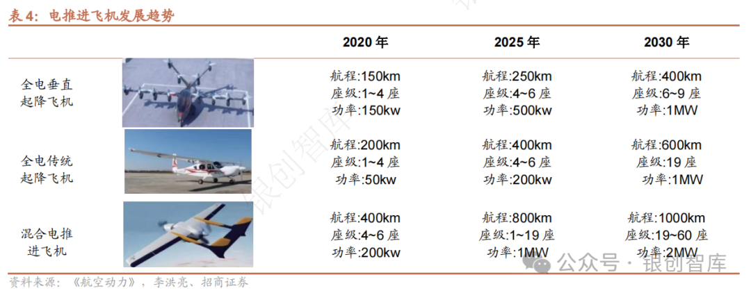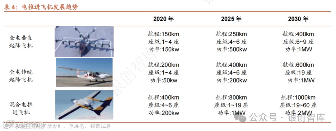 通用航空中多座级通勤领域,混动更具商业可行性。基于现有技术的全电垂直起降飞机,初步具备 1.5h 航时、200km 航程的能力,有望于 2025 年投入商业运营。而对于航程为 400km 以上,座级别为 6~19 座的通勤类飞机,全电动飞机商业化运营可能性很低,通过混合动力技术实现是最可行的方案。因此,基于电推进技术攻关和成熟度提升的角度,大型电力推进飞机中短期尚不具备商业可行性。然而,座级小于 19 座的混合电推进飞机已逐渐成型,可在未来解决部分航空器电动化过程中的“里程焦虑”问题。