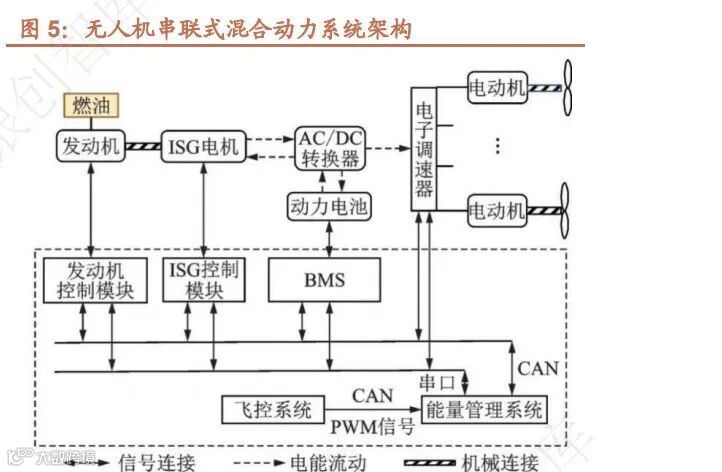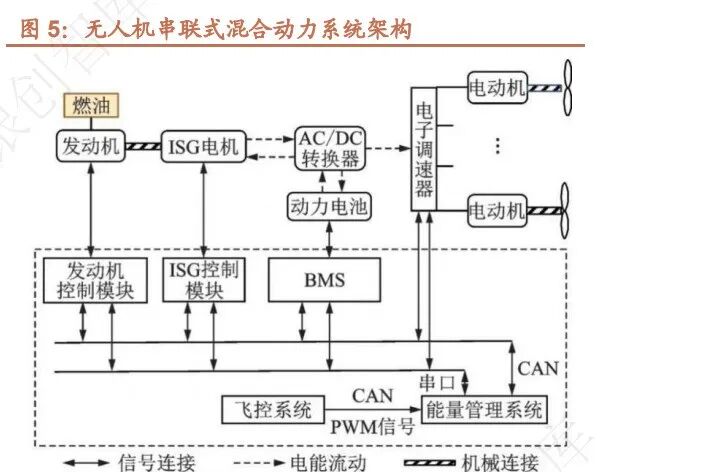 油电混动升力巡航是无人机热门方案。大载重、长续航的无人机,目前业内主流采用油电混动升力巡航的路线。以纵横 CW100 大载重中型无人机、CW40长航时小型无人机为例,均采用油电混动的动力模式+升力巡航(复合翼)的构型。其中,升力桨是电动,分布式的电动升力桨高效实现了垂直起降;起飞后,升力桨关停,转为固定翼+活塞发动机推进。注意升力桨的电池是单独充电,因此两套动力系统之间既没有串联也没有并联;活塞发动机也搭配了发电机,但只用于机上电子设备供电,不给升力桨供电,类似于燃油车的小电瓶。同时,业内无人机串联式混合动力系统架构也很成熟。