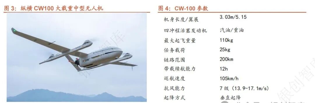 从参数上看,CW100 任务载荷 25kg,带载续航能力 12 小时;CW 任务载荷9kg,带载续航能力 6-10 小时。目前业内纯电无人机续航时间在几十分钟到 2-4 小时不等,燃油/混动机型则可以做到十几小时,续航、载重优势突出。