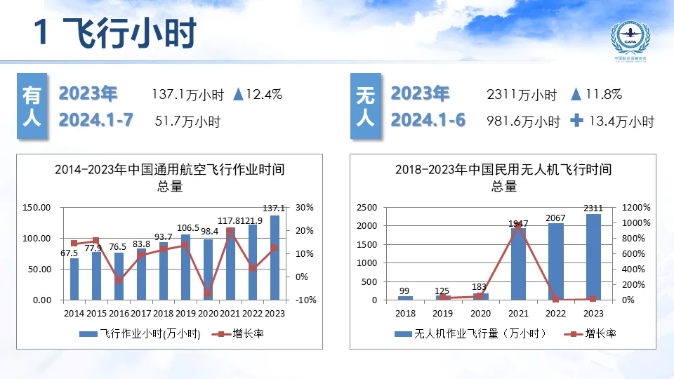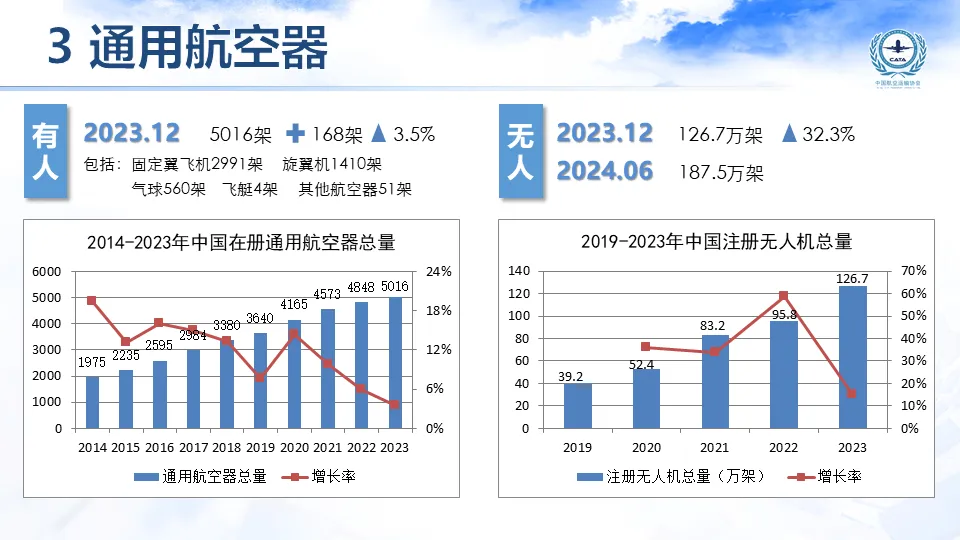 据通航委消息,10月26日,在中国航空运输协会通用航空和低空经济发展论坛上,中国航空运输协会发布了《2023-2024中国通用航空发展报告》《2023-2024中国民用无人驾驶航空发展报告》。中国航协通用业务部副总经理杜万营解读了两个报告中有关低空运营、制造、保障和服务产业等10组主要数据。以下是通航委发布的相关数据,供大家参考。数说我国通用航空发展“成绩单” 新质生产力成为重要驱动力