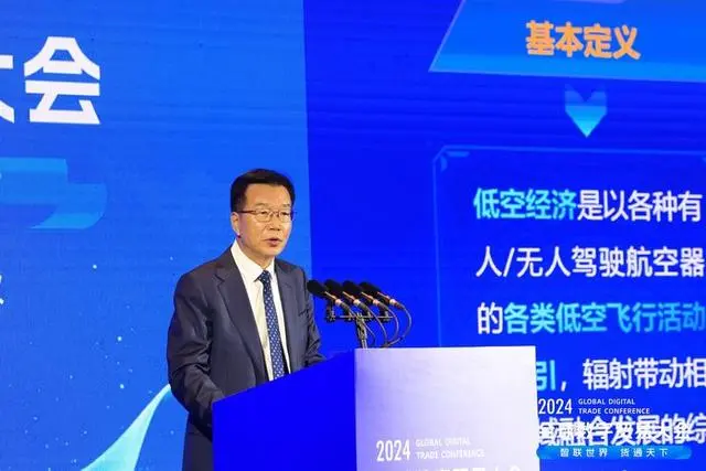 在2024数字贸易大会上,中国信息协会会长王金平发表了《低空经济产业发展思考》主题演讲。