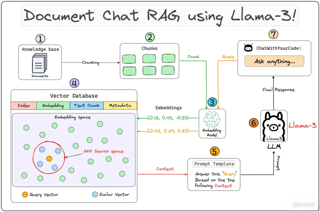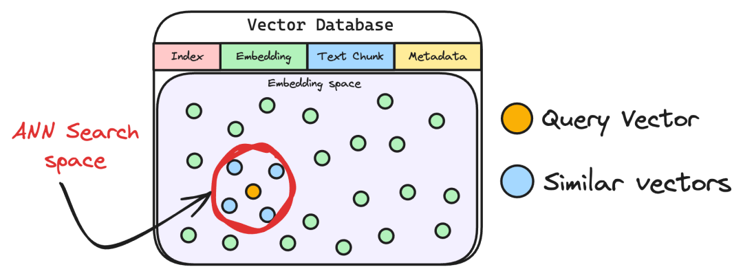 2. 然后,将向量化的查询与数据库中现有的向量进行比较,以找到最相似的信息。常规的向量检索ANN算法,我们还支kNN算法,向量库的表结构的基础字段索引,向量块,原始文本块,原数据字段。