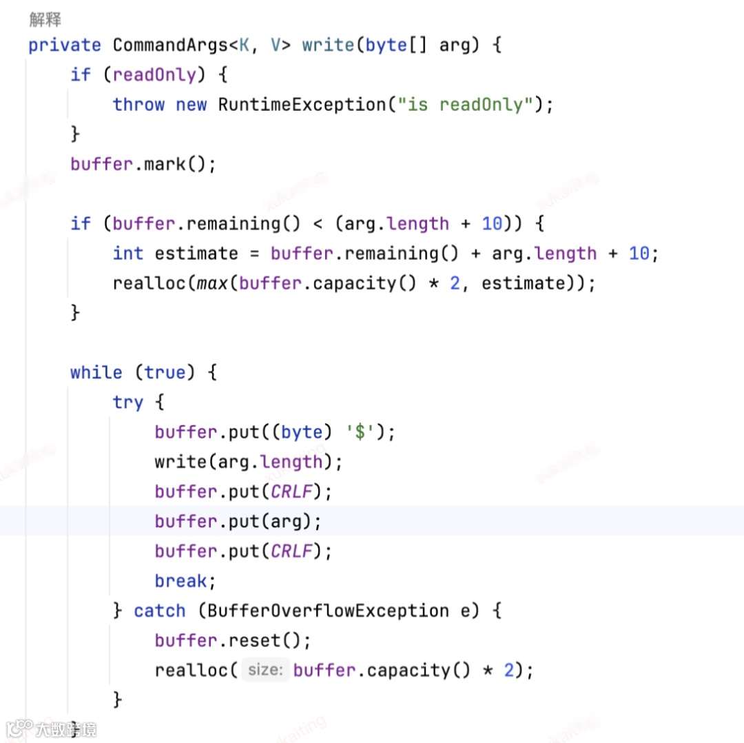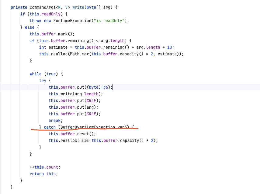 从上方的信息,比较容易看到是SDK在定义缓冲区的大小时长度不足预期,往缓冲区放的时候出现了溢出异常,但是SDK的代码捕获了这类异常,同时将缓冲区的大小扩大一倍类解决问题。还是那句话,您要问业务功能上有没有问题,那当然是没有。但是您要问这种写法真的好么?那笔者觉得这真是一个让人可以深思的好问题。