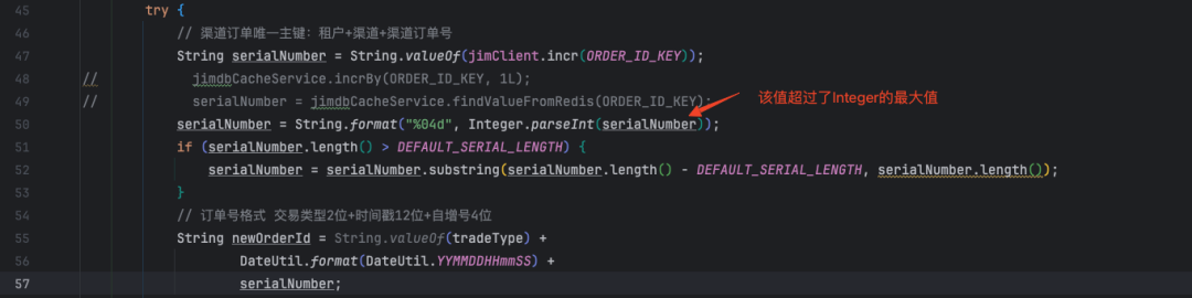 以下图为例,程序中执行了Integer.parseInt的方法,一般情况下功能也没有什么问题,但是如果出现需要转换的值,超出了int的最大范围,或者需要转换的值,从数字类型变更调整为了字符串类型。两种场景均会导致转换失败,如果此项转换出现在主流程或者业务流量较大的场景,出现的问题影响及损失就不可计量了。