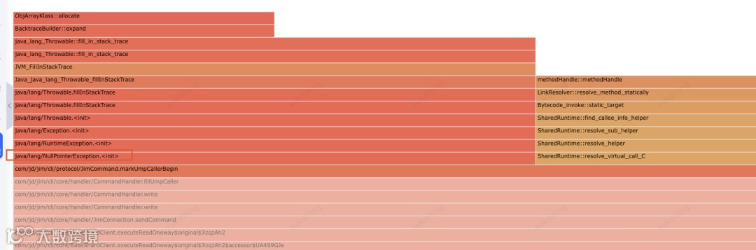 这个问题出现的场景为发现上方的缓冲区异常后,我们应用开发人员抓紧升级到2025年7月18号升级的最新版版本2.3.1-HOTFIX-T2,继续开启压测和火焰图后,发现应用中存在空指针异常的情况出现。还是说明一下,这个不影响业务功能,只是对性能有一定的损耗,具体损耗会依据应用系统的不同略有差异。
