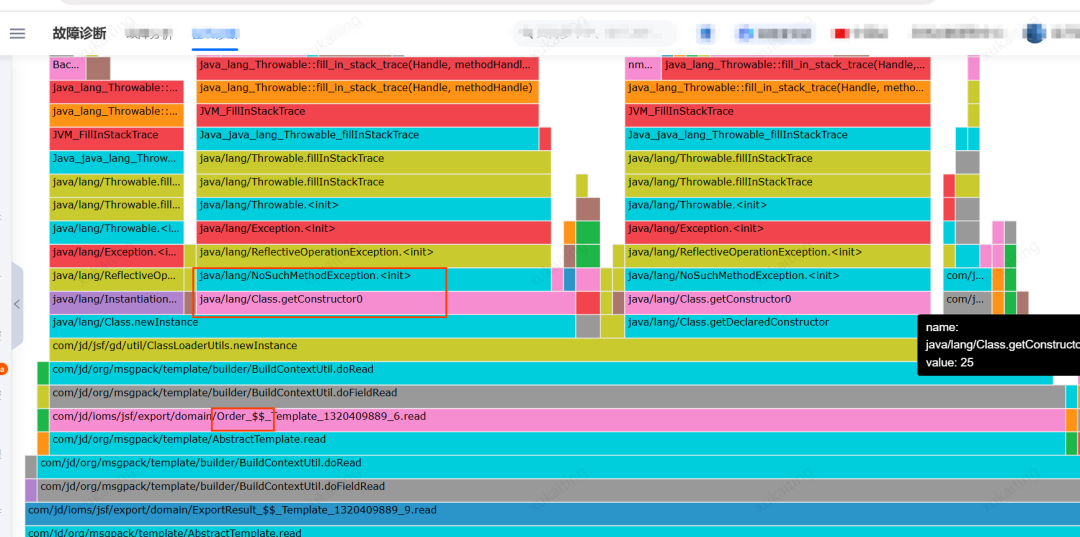 JSF目前为京东平台内部使用的RPC框架,此技术框架目前提供2种交互协议:msgpack和hessian。容易出现问题导致存在高可用隐患的场景为:服务提供方和服务依赖方,交互的时候使用的是msgpack的协议,且交互的输入输出有使用BigDecimal的话,通过火焰图等性能分析工具分析应用程序运行时状态,我们会发现火焰图中有大量的无法找到方法的异常。