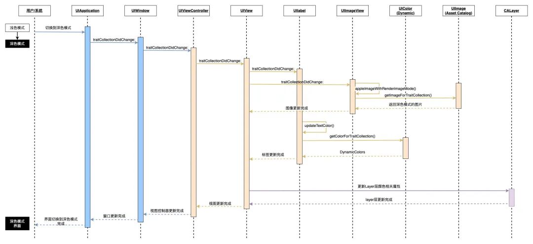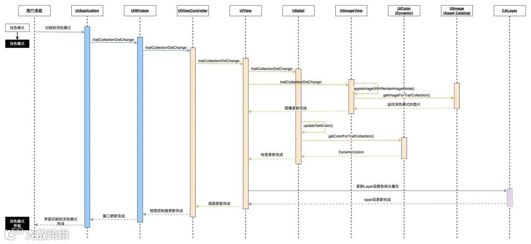 ROMA 只提供了简单配置就可以让业务适配视图在深色模式的显示,极大简化了业务的适配工作,其实App切换深色模式的处理流程涉及视图层级的方方面面,下面以iOS端为例,着重从视图层级的变化上介绍模式切换所触发的整个流程。