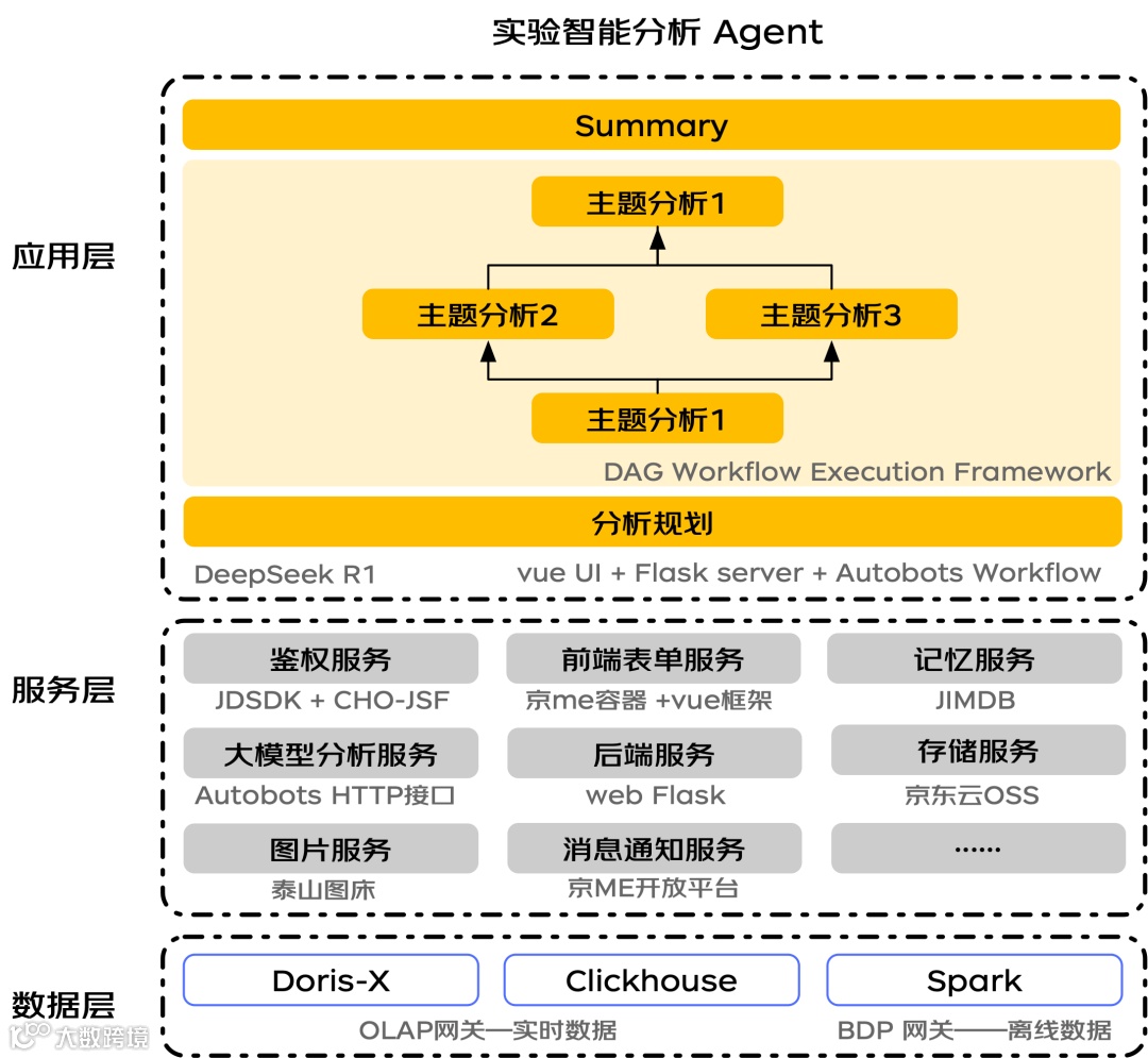 下图为Agent整体架构,采用模块化分层解耦设计,旨在实现“汇总数据—分项分析—总结呈现”的全流程智能化分析闭环。应用层作为核心业务中枢,集成了分析规划、主题分析(基于DAG Workflow Execution Framework实现任务编排)与结论汇总模块,并通过DeepSeek R1/V3模型提供分析支持,确保从宏观洞察到微观挖掘的灵活切换。服务层包含鉴权服务、前端表单服务等通用能力,选用JDSDK + CHO-JSF等公司内部成熟的技术方案,保障系统的高可用性与扩展性。数据层则依托Doris-X、Clickhouse、Spark等分布式引擎,构建OLAP网关(实时数据)与BDP网关(离线数据)双通道,既复用部门现有报告工具的指标体系,又通过独立开发的FDR分析模块实现特殊需求,在保持各工具独立性的同时完成数据统一拼接。