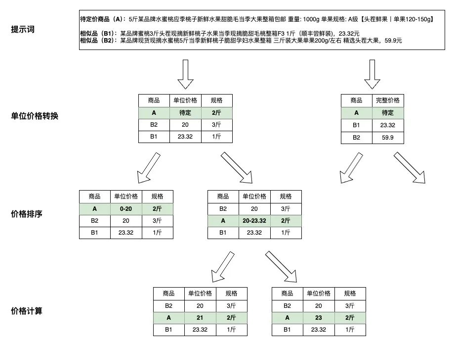 在计算价格环节,我们会将待定价商品的描述与相似品的描述及价格构造成prompt,并通过LLM生成预估价格。整个CoT过程分为以下3步: