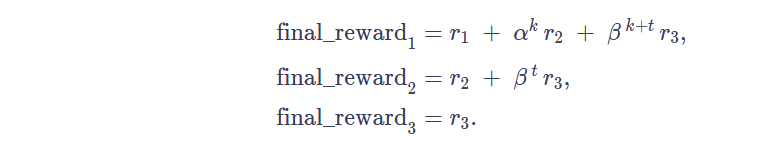 而在我们的优化中,引入了过程奖励设计:我们在每一步中设置过程奖励,同时考虑后续步骤的奖励并将其累积到前面的步骤中,从而确保初期关键token也能获得合理的reward。例如: