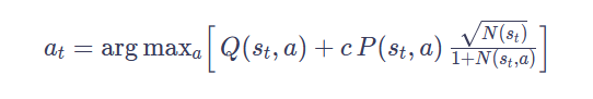 在自对弈阶段,对于每个局面st,算法在当前搜索树中一次只扩展一个新子节点,所选动作由节点的价值估计 和策略先验 共同决定: