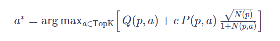 Selection & Expansion:在当前节点p(前缀)上,先用策略网络生成 top-K 候选动作
