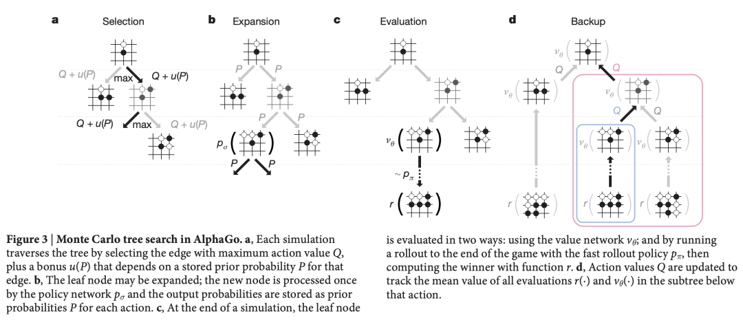 扩展后,从该新节点模拟直至终局,统计胜负信号z∈{+1,−1}作为reward,结合价值网络在新子节点估值得到Q值,也在回传阶段更新整棵树中经过节点的Q值: