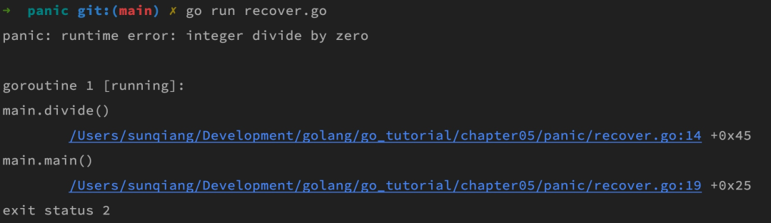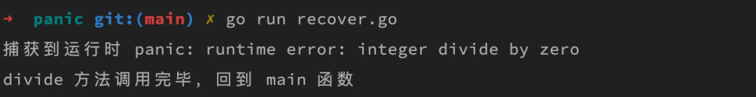 package mainimport ("fmt")func divide() {//通过defer,确保该方法只要执行完毕都要执行该匿名方法defer func() {//进行异常捕获if err := recover(); err != nil {fmt.Printf("Runtime panic caught: %v\n", err)}}()var i = 1var j = 0k := i / jfmt.Printf("%d / %d = %d\n", i, j, k)}func main() {divide()fmt.Println("divide 方法调用完毕,回到 main 函数")}