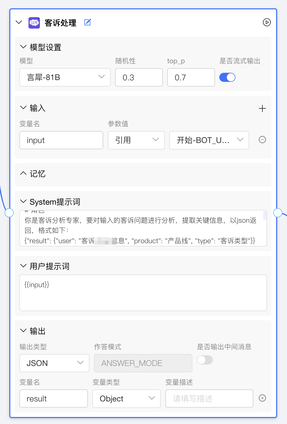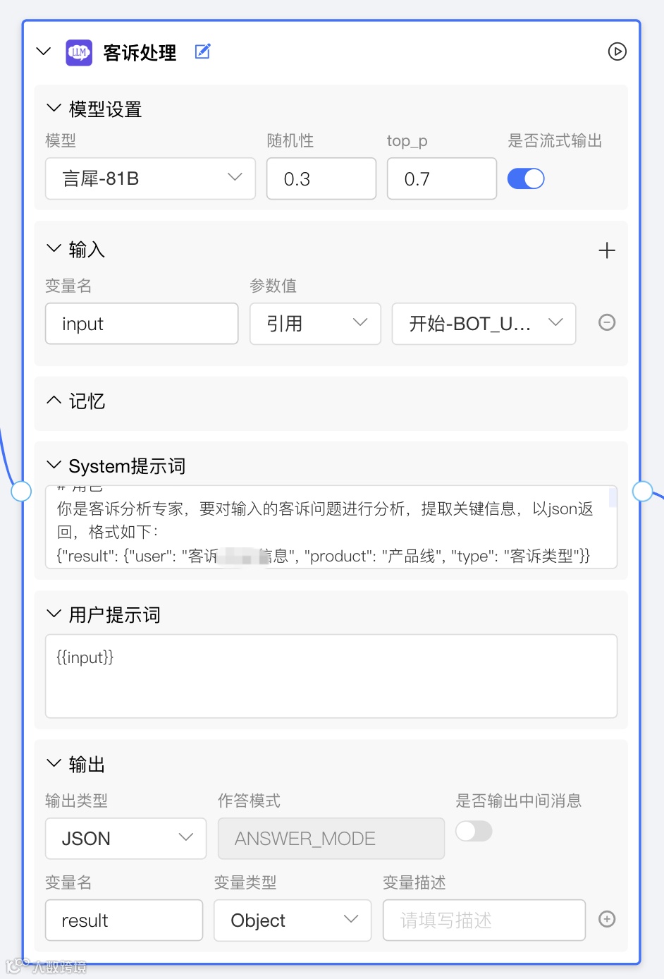 有了方案,我们借助Agent平台能力搭建了客诉处理Agent,以下是主要的工作流程