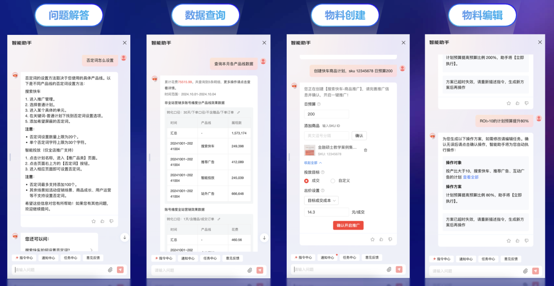 基于以上的能力,构建了京东广告智能助手。包含了问题解答、数据查询、物料创建、物料编辑等场景。