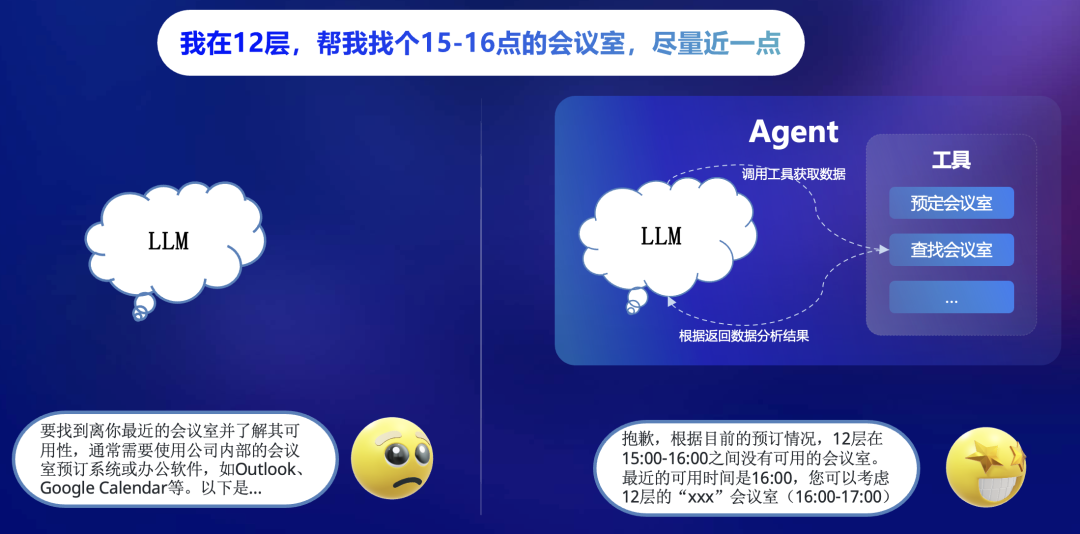 那么,如果我们希望借助大模型来帮我们提效,计划通过一句话就实现会议室的预定:我在12层,帮我找个15-16点的会议室,尽量近一点