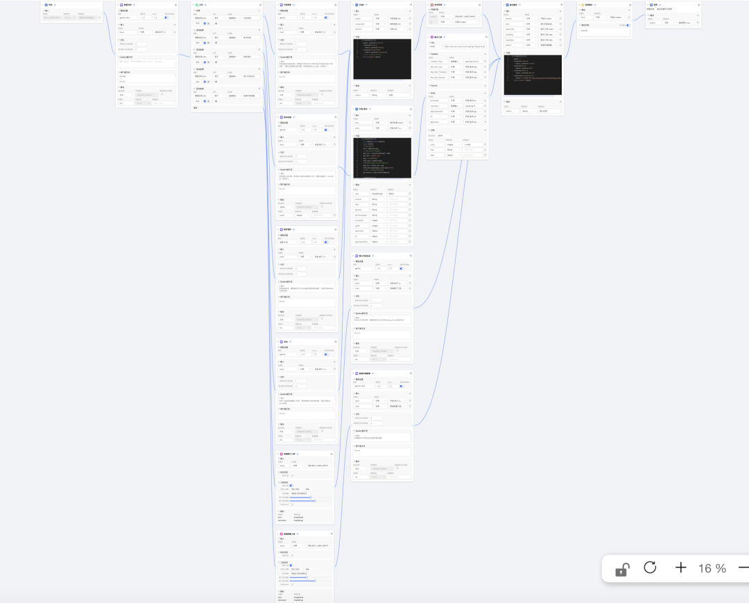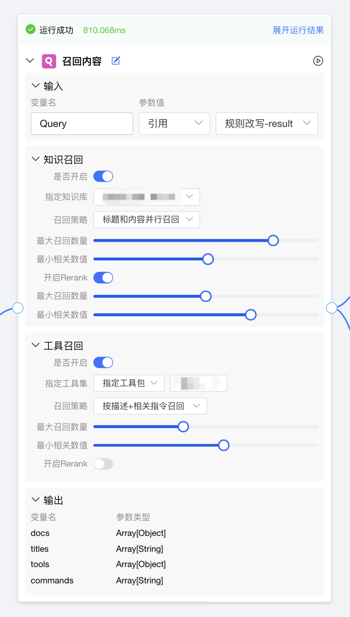 工作流中,可以随意拖拽编排工作流程,比如:召回节点可以设置召回策略、召回数量、最低分值等;大模型节点可以设置System、User提示词、历史会话轮数等。