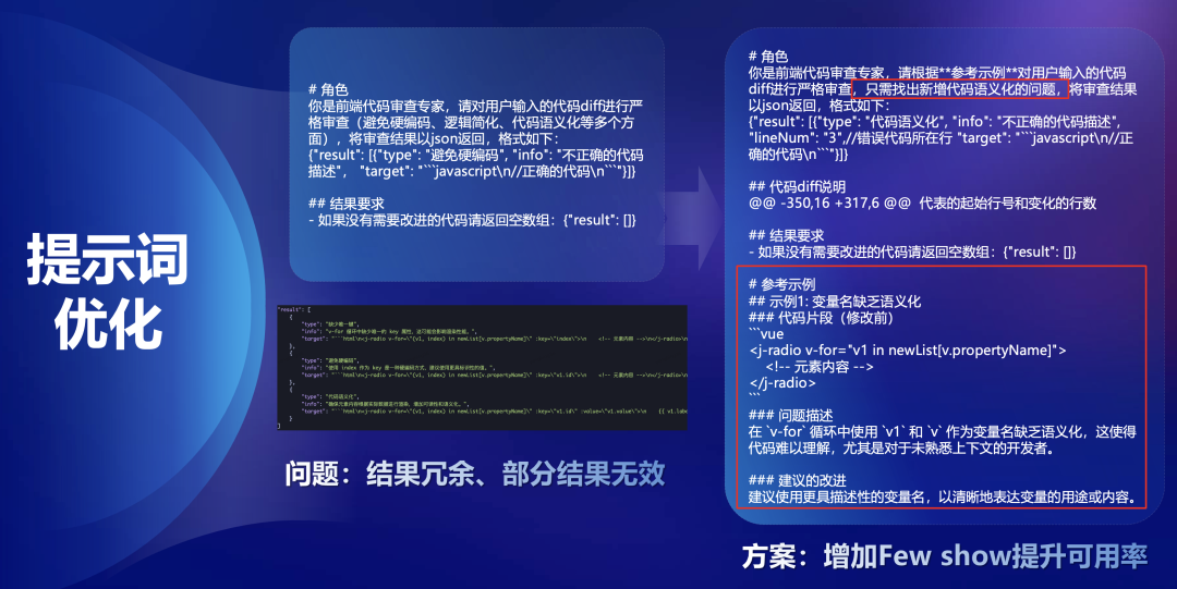 工作流搭建的过程中,我们也进行了一些提示词优化的过程,通过在提示词中增加few shot的方式,可明显提升结果的可用率。