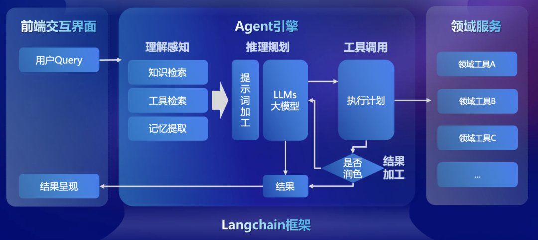 将以上各种能力整合,最终能力演变为下图。这一版底层我们采用了Langchain框架。