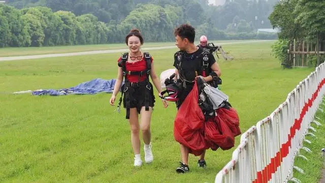 不仅仅是本地游客,连外省游客都会前来体验高空跳伞。来自河南信阳的岳如在网络上刷到后,便专程乘坐动车来到成都崇州体验高空跳伞。