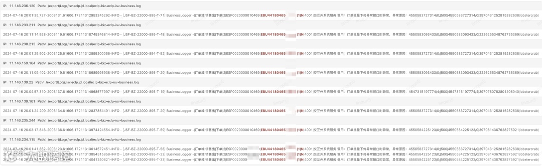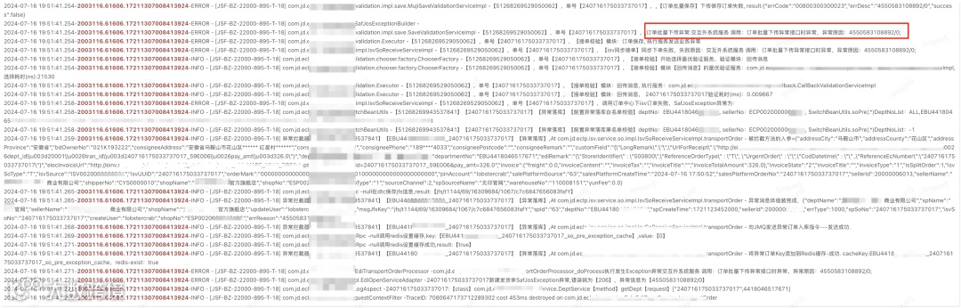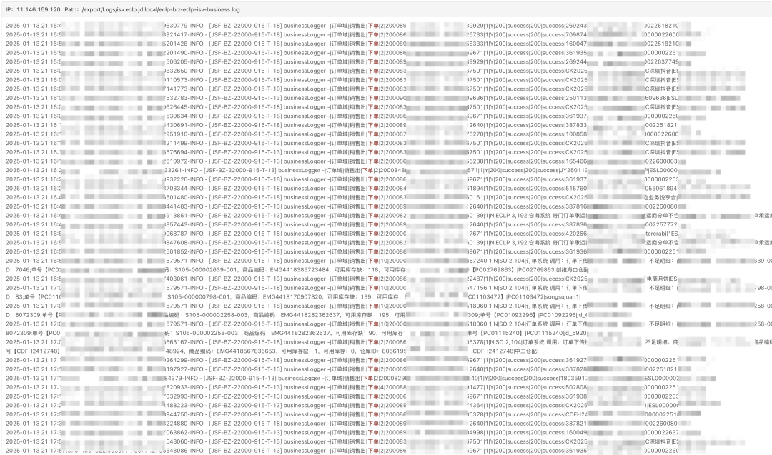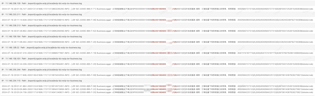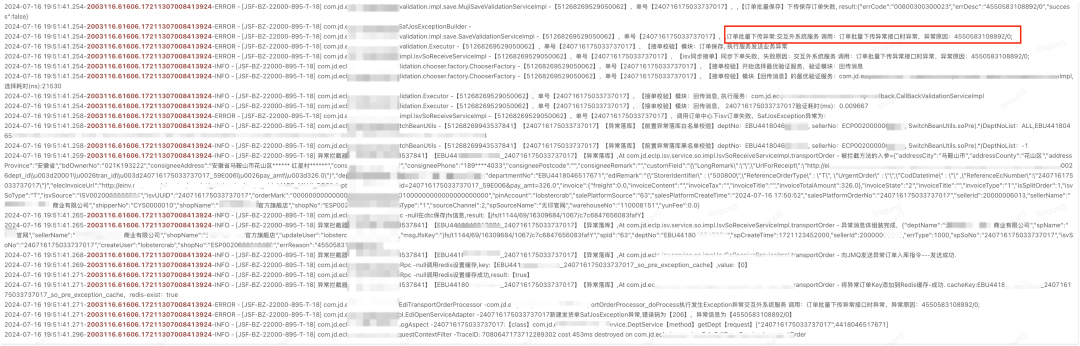blogger.info("|订单域|销售出|下单|{}|{}|{}|{}|{}|{}|{}|{}|{}|{}|{}|{}",order.getSourceChannel(), order.getShopNo(), order.getDepartmentNo(), 1,result, code, message, subCode, subMessage,order.getIsvUUID(), context.getPin(), soNo);业务逻辑埋点打印业务日志