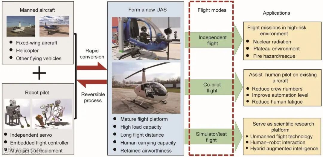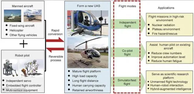 这项研究的创新之处在于,它采用了非入侵式的转换方法,使得有人飞行器可以快速、可逆地转换为无人机系统。这种方法不仅保留了原有飞行器的载荷能力和安全水平,而且避免了对原飞行器进行复杂改装的需求。此外,该驾驶机器人还可以作为副驾驶飞行员,提高现有飞行器的自动化水平,为飞行员助手、智能驾驶舱等新兴技术提供了研究平台。