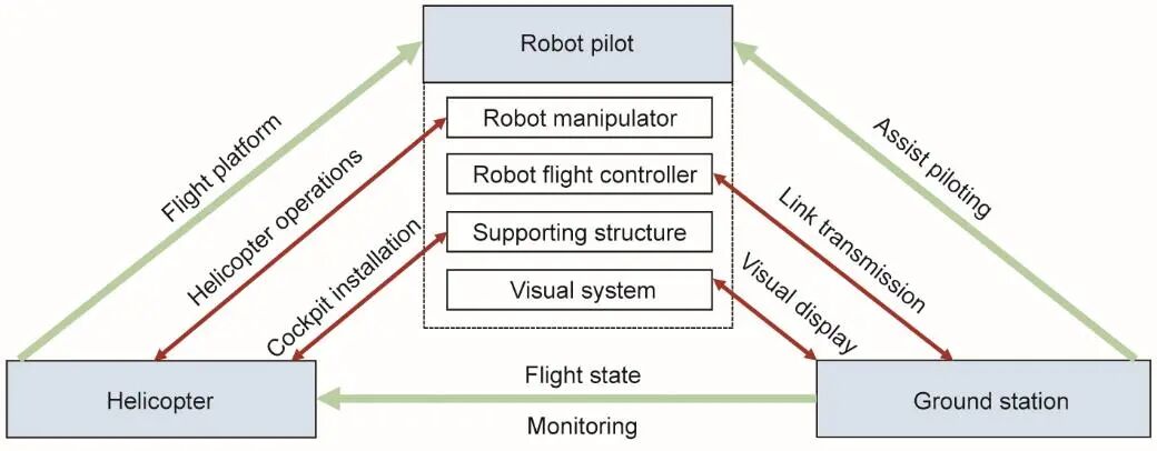飞行器驾驶机器人依赖于多个功能子模块实现可靠的自主飞行,本节对飞行器驾驶机器人及其不同的飞行模式进行阐述,并在此基础上,提出可独立驾驶载人直升机的直升机驾驶机器人总体设计方案。飞行器驾驶机器人本质上属于机器人系统或无人系统的范畴,它集成了独立的传感器系统和伺服控制系统,可以像人类飞行员一样与驾驶舱内的电子设备和机械设备进行交互,从而与有人飞行器组合成一个新的无人飞行系统,如图1所示。一般来说,飞行器驾驶机器人的飞行驾驶可分为全自主飞行模式和有限自主/辅助飞行驾驶模式。在全自主飞行模式下,飞行器驾驶机器人可以独立驾驶有人飞行器,在对人类飞行员有危害或高风险环境中完成飞行任务。在辅助驾驶模式下,机器人系统可以与人类飞行员合作,减少机组人员数量,减轻飞行员疲劳。这两种飞行模式都需要成熟的地面站系统来支持飞行驾驶。地面站提供完整的通信链路,以实现对机器人操纵的远程监控、飞行状态感知和遥操作功能,这对实现安全可靠的飞行具有重要意义。