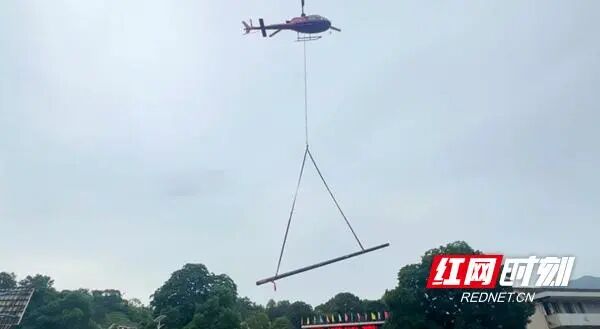 6月25日下午,在湖南省怀化市沅陵县五强溪镇中心小学,一架直升机吊装起一根长12米的电杆,起飞运送至11公里外的10千伏柳林汊线荷花坡支线抢修现场,开展安装作业。