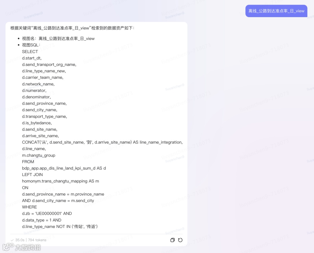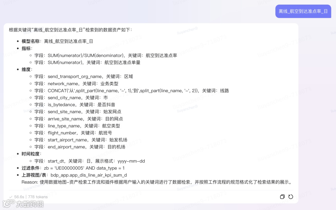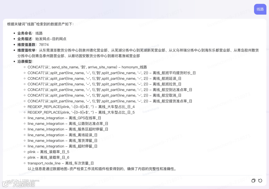 基于逻辑模型元数据,创建语义词典构建的调度任务,并允许业务方添加业务方言和语义同义词,与血缘沿袭关系共同组成运力业务域的语义知识图谱,目前已积累70余万实体。语义词典用于对用户的自然语言问题进行切词分析,将业务语言转化为技术语言。后通过语义血缘关系,结合RAG能力,利用时间、维度、指标、分析方法等元数据的组合,推理每个语素在知识库中的坐标,并精确匹配到相应的逻辑模型,从而实现自然语言驱动的数据查询和分析的可行性。