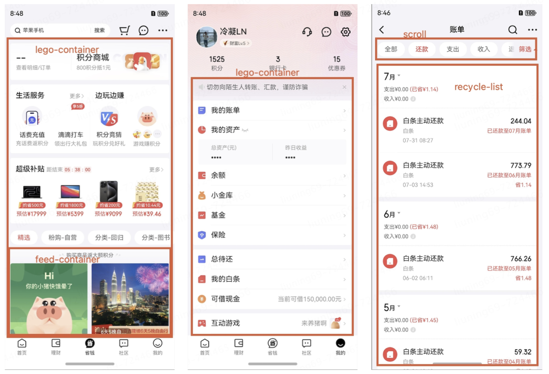 对于列表布局,动态化提供了<scroll>、<slider>、<recycle-list>、<waterfall>、<lego-container>、<feed-container>等标签,对于多页面管理提供<page-container>、<tab-bar>等标签。业务仅通过修改标签属性,即可实现子视图在列表内以不同的布局方式显示。