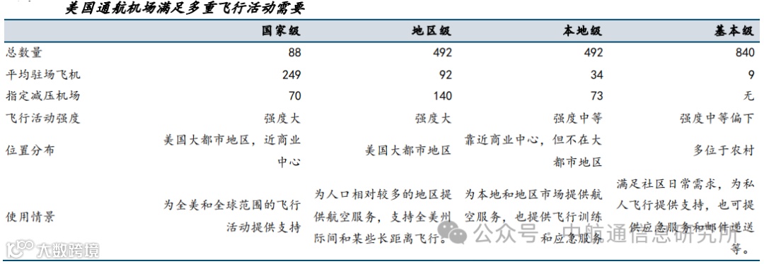 美国完备的基础设施建设是通航产业和低空经济发展的根基。在机场建设方面,据《国家一体化机场系统计划(2019~2023)》,FAA 列出了 2941 个通用航空机场,划分为国家级、地区级、本地级、基本级和未分类五大类,分别适用于不同地区和场景,以满足美国通航不同需求的飞行活动。在空管系统方面,美国 FAA 早在 1998 年就制定了详细的空中交通流量管理(TFM)长期发展计划,尤其注重通信、导航和监视设备等外围设备的改善。