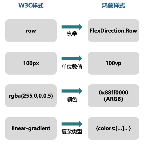 对比可以看出,CSS 样式和鸿蒙样式在单位系统和数据表示方式上存在显著差异。CSS 提供多样化的尺寸和颜色单位,而 ArkUI 的 CAPI 接口采用更统一的表示方式。