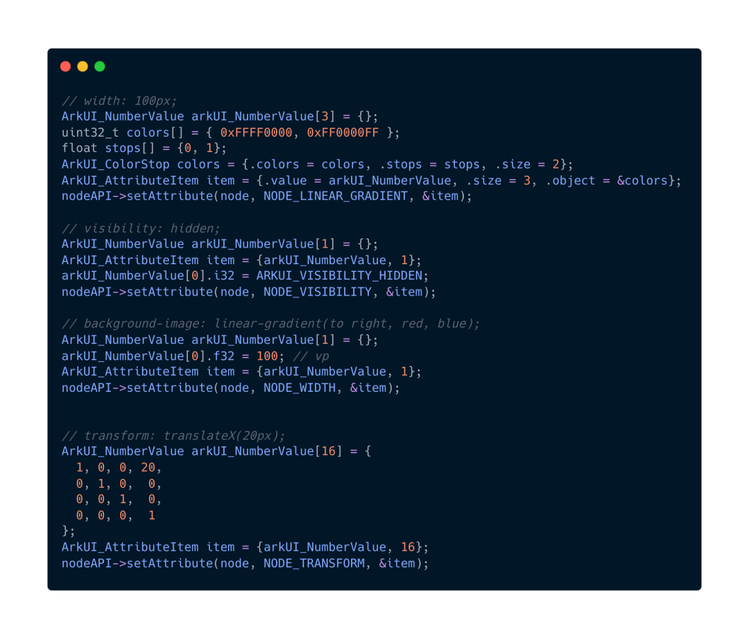 ArkUI 的 CAPI 接口将所有尺寸统一为 vp 单位,颜色采用 0xAARRGGBB 格式的 uint32 类型,对于渐变和 transform 等复杂样式属性,更是需要转换为颜色停止点和角度值列表和矩阵运算,这样的接口简洁但需要调用者根据具体场景完成必要的单位转换。
